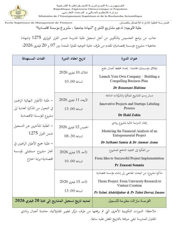 تعلم إدارة المدرسة العليا للإدارة الأعمال بتلمسان كافة الطلبة لجميع المستويات والتخصصات أن انطلاق السداسي الثاني للسنة الجامعية 2025-2026 يكون ابتداء من يوم السبت 24 جانفي 2026، طبقا لما هو منصوص عليه في البرنامج السنوي مع تمنياتنا بالتوفيق والنجلح